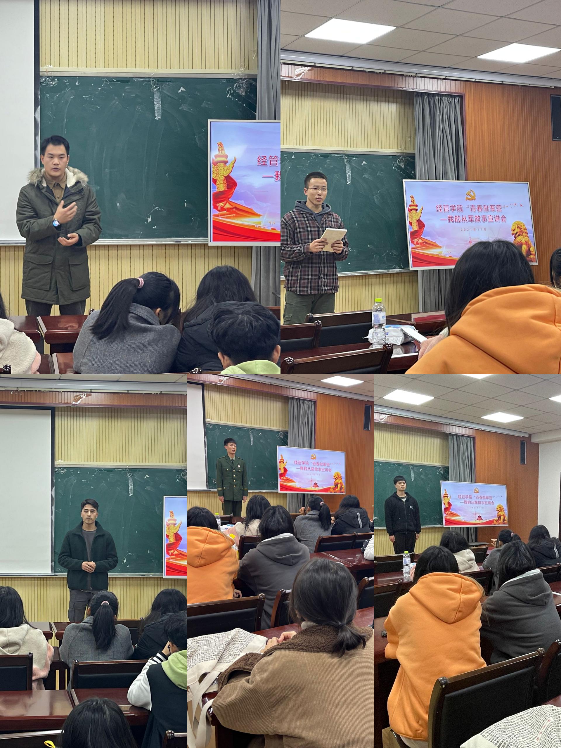 优秀退役大学生张果、余威威、谢嘉楠、李金泽、守库尔等,向来自学院各年级、各专业具有参军意向的部分同学分享了自己从军的经历和感悟,号召同学们勇敢追逐青春梦想,用热血唱响新时代强军之歌,将爱国之心化为报国之行,积极投身军旅报效祖国。