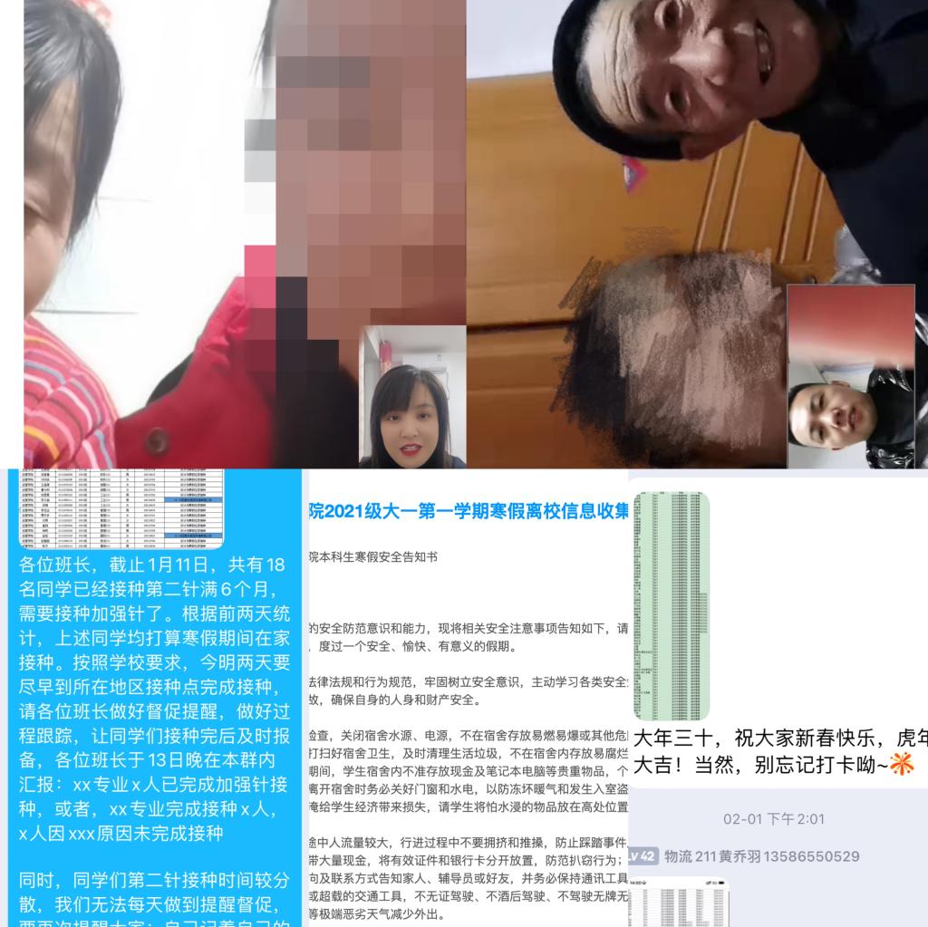 关注学生安全动态,2021级严格落实学校疫情防控要求,学生离校前详细统计学生离校时间、目的地、航班车次等相关信息,在学生离校返家后落实到家情况,并重点关注2名中高风险地区学生返乡及安全状况。做好假期健康防护,假期期间督促学生完成每日健康打卡,及时掌握学生假期出行轨迹及健康状况,教育引导学生做好居家疫情防护。强化疫苗接种工作,细致建立疫苗接种台账,定期更新学生疫苗接种情况,引导学生“应接尽接”,自愿在家乡就近接种。加强家校育人合力,年级根据学校及学院寒假走访规定开展“云端”走访工作,深入走访2名困难学生,并与学生、家长就学校政策、学生在校情况等开展良性互动,培育家校共育良好氛围。关注心理健康动态,利用年级QQ群、专业微信群、微信公众号等开展心理健康知识宣传,密切关注学生网络思想动态,并适时做好挂科学生、家庭困难学生、心理危机学生的心理困境纾解,助力学生度过平安充实的假期。