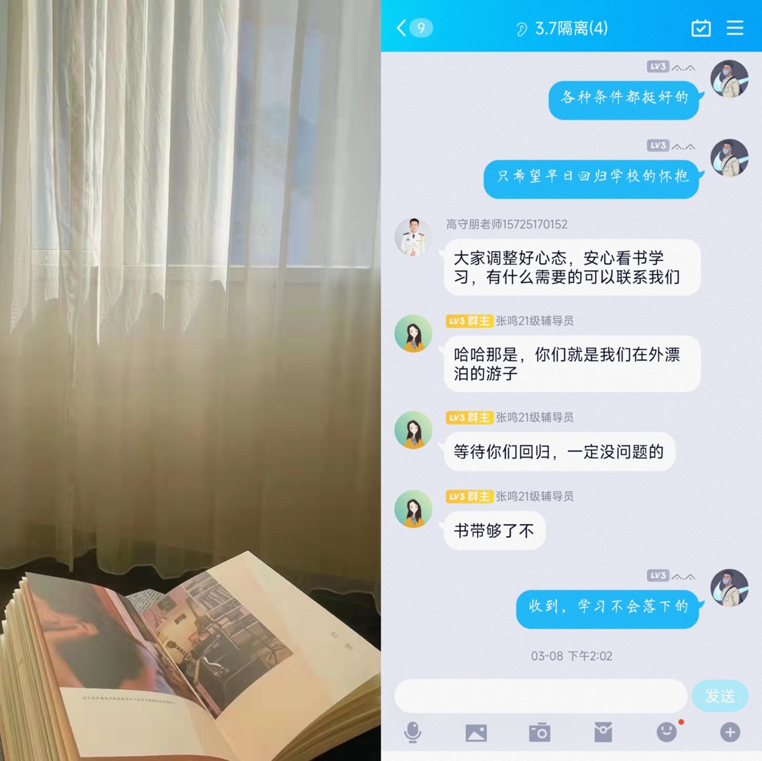 “嘉楠,东西收拾好了吗,我在楼下等你。”坐上了高老师的车,思绪又变得混乱起来,短短几分钟的车程像是走了很久很久,高老师拍着我的肩膀,“没什么事,观察几天,不要往坏处想,”说着就拉起我的行李帮我和同学们安排住宿。学校也暖心地为我们整修了住宿环境,提供各种生活所需。后来,老师每2小时的一次电话和零食物品,同学朋友每时每刻的关心问候,让我不安的心情甚感温暖。