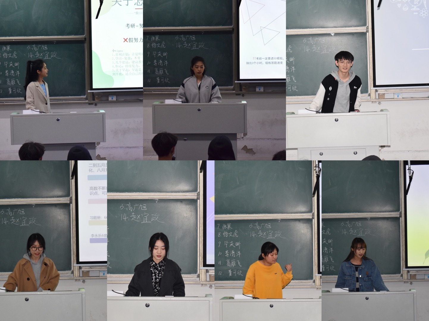 )结合自身给同学们“失败经验”,强调了不要把“明天”当借口而且给想参军入伍的同学们树立了榜样;李清洋(南昌大学)重点介绍了为什么要考专硕这一方面;高广旭(上海大学)和赵宜政(山东大学)两位保研的学长给同学们传授了保研的经验和注意事项。