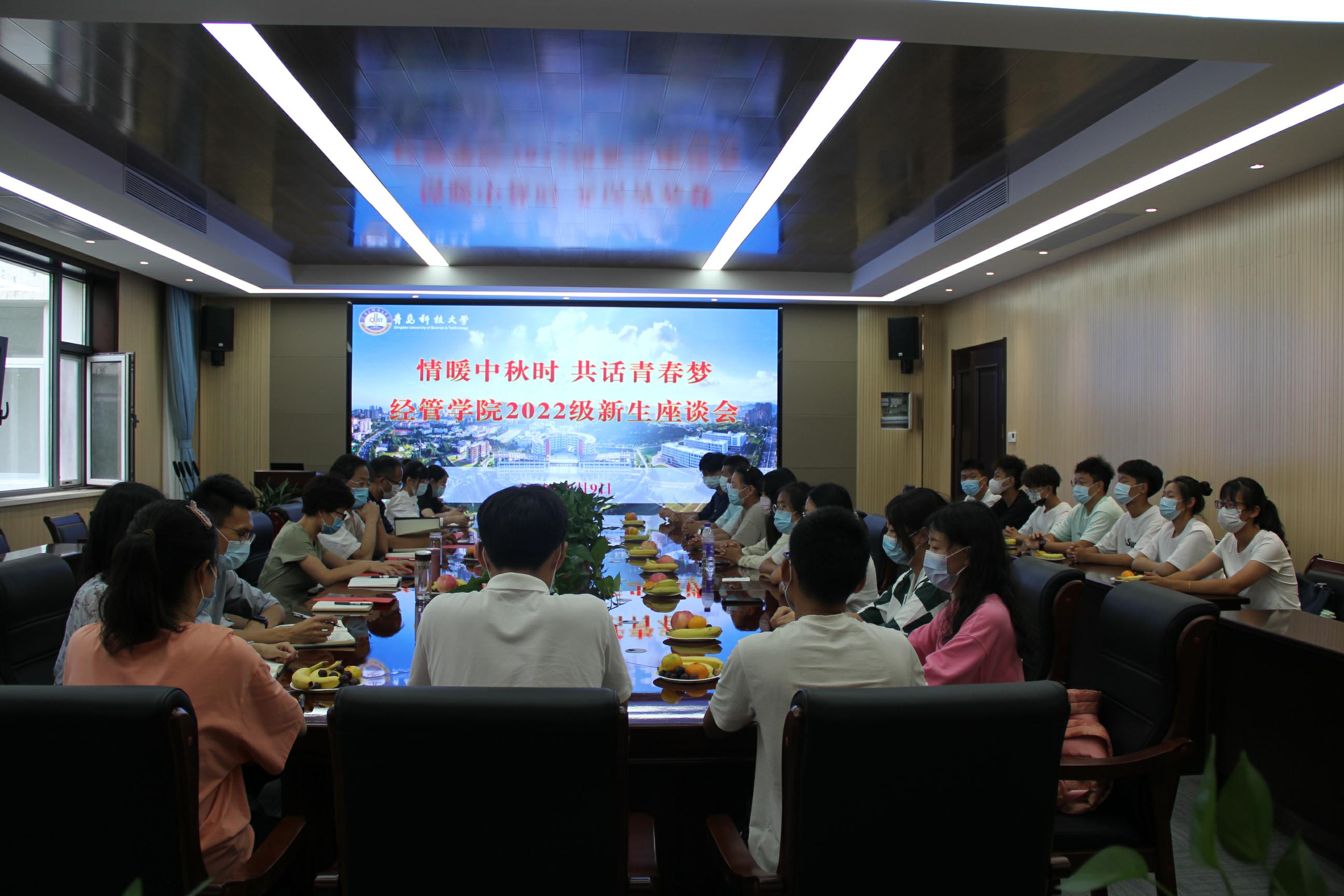 在经管楼313会议室举办“情暖中秋时 共话青春梦”2022级新生代表座谈活动。学院党委书记李德成、院长李勋来等学院领导班子成员,全体党支部书记、学院学工办主任兼团委书记王聪、学工办副主任兼团委副书记张显全及22级新生辅导员参加会议。22名新生代表通过线上线下方式参会。