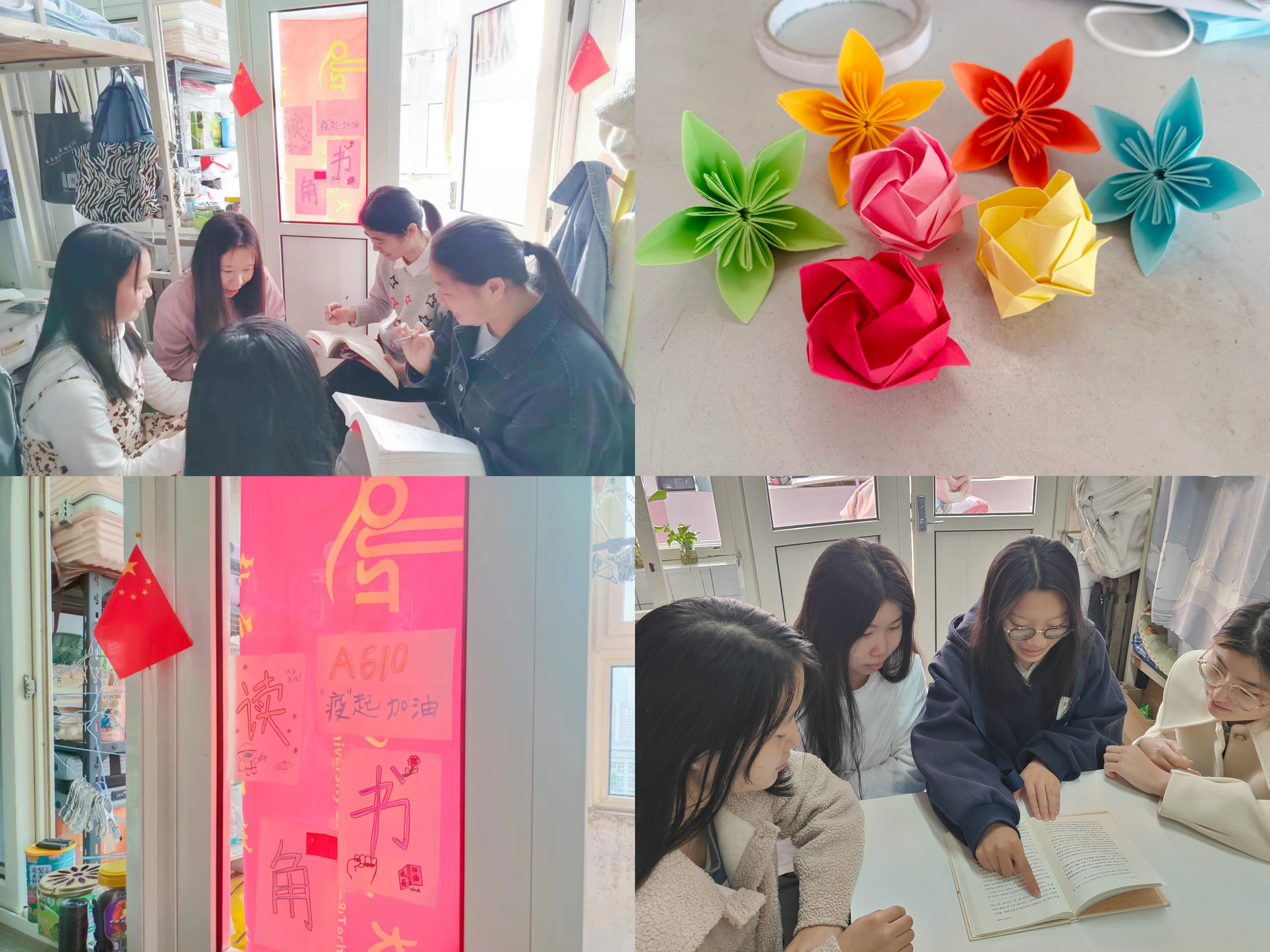 书香伴人心,温暖静默时。以宿舍为单位,开展"沐浴书香,‘悦’读战‘疫‘"读书茶话会活动。以共读照亮"疫"时黑暗,引导学生在理论学习中汲取智慧力量,厚植爱党爱国、爱校荣校情怀,以积极乐观的精神风貌凝人心、聚力量,坚定永远跟党走、同心战疫情的决心与信心。