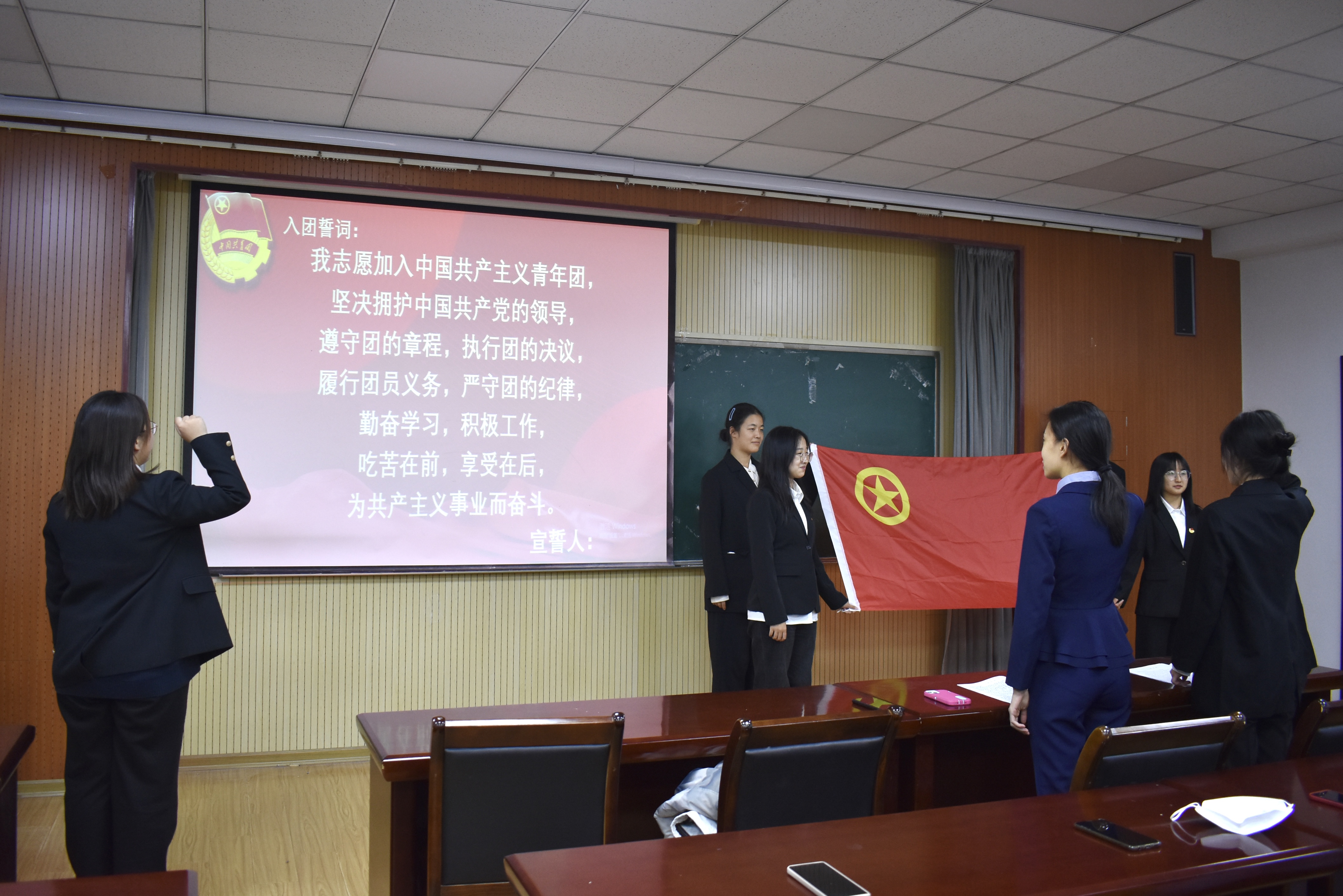 团委于经管楼419会议室举行新发展团员入团仪式,学院团委老师、优秀团员代表及新发展团员参与仪式。