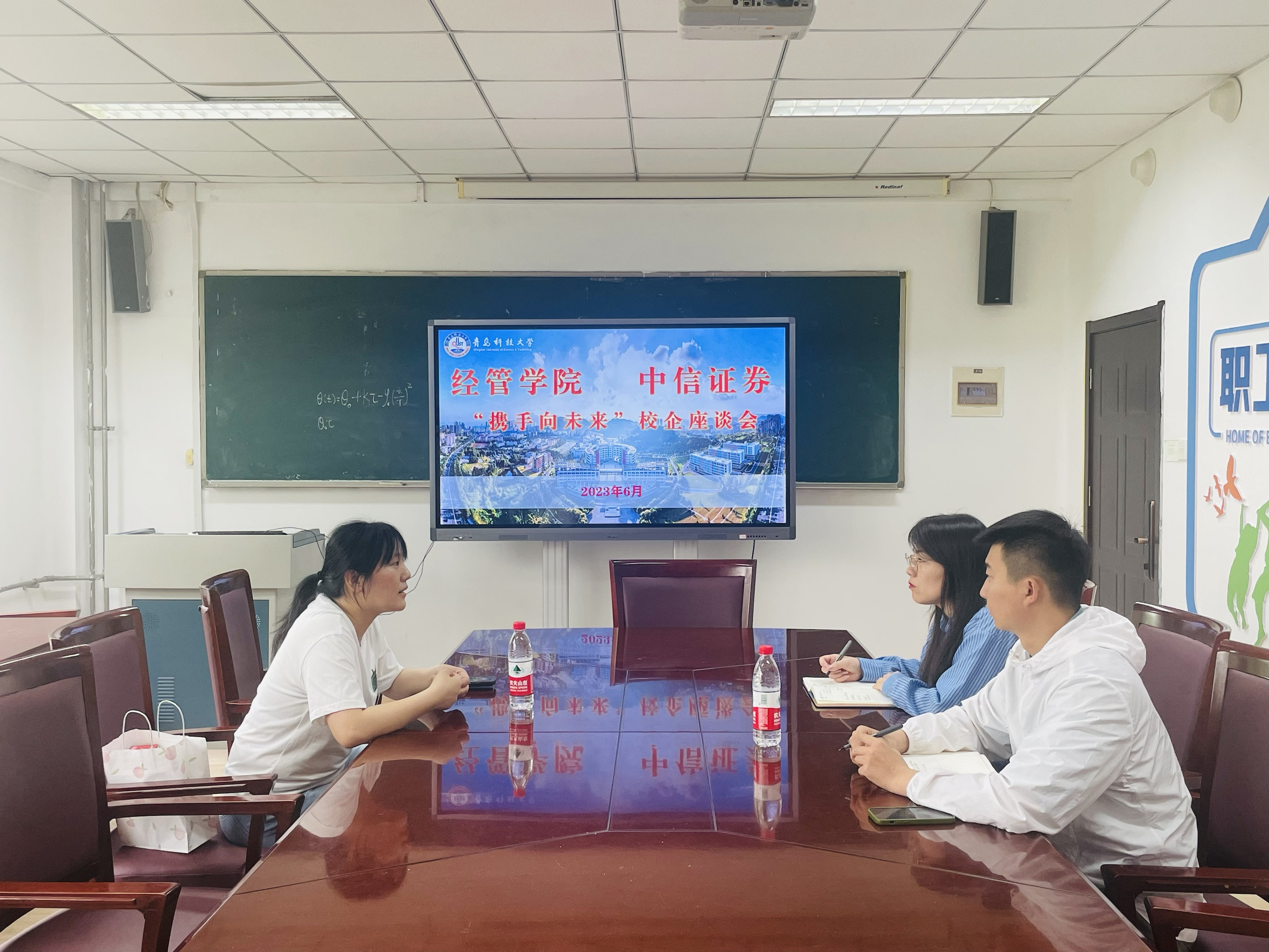 与中信证券于经管楼415会议室举办“携手向未来”校企座谈会,中信证券统一客户联络中心许娜经理来校交流,探讨人才招聘、实习合作等相关事宜。学院2024届毕业生辅导员付凯、袁绍正参加座谈会。