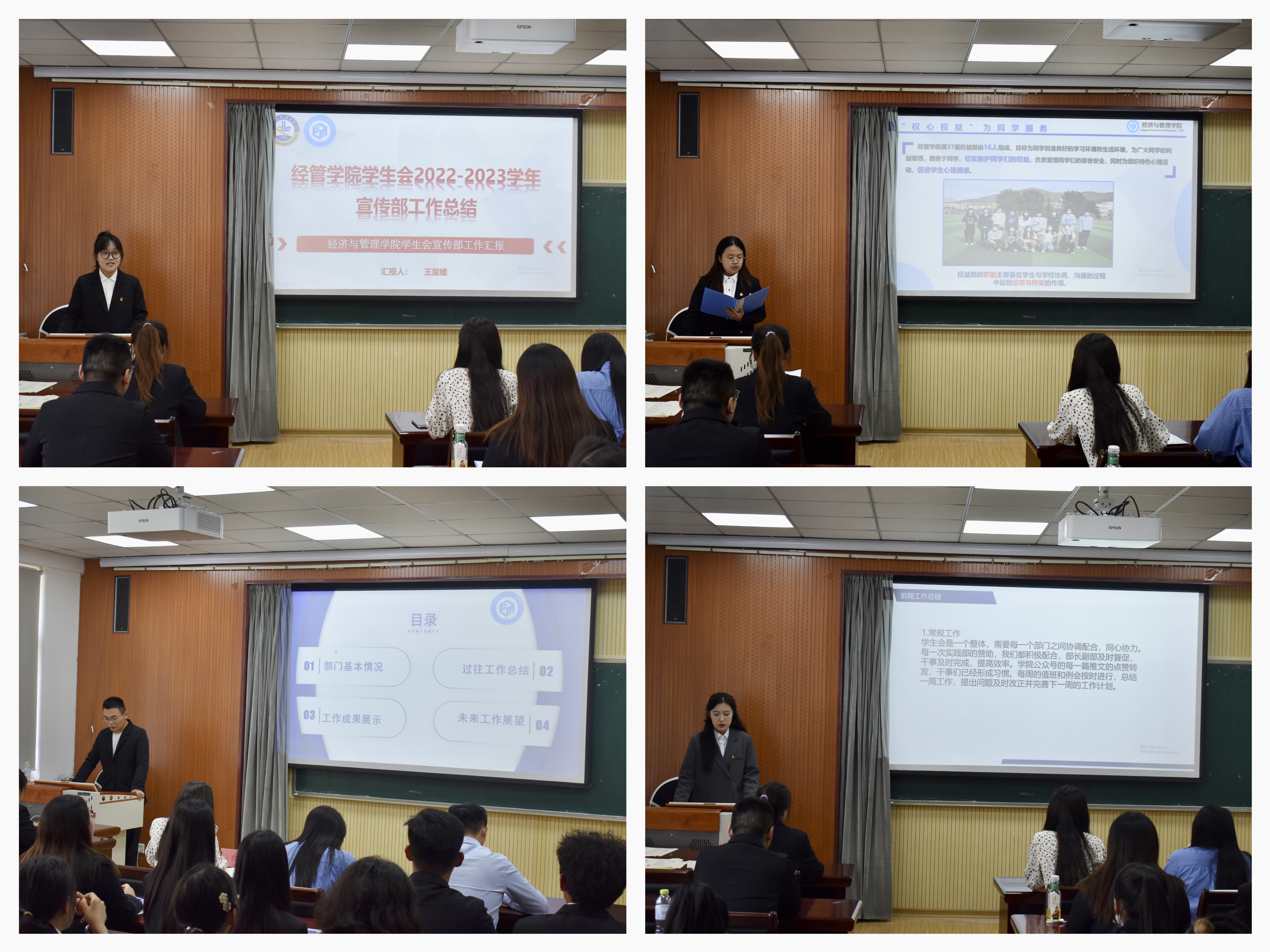 第三十七届学生会紧密围绕学校和学院中心开展特色工作,圆满完成了2022-2023学年的工作任务,为进一步深化高校学生会改革,加强学生会自身建设,建立职能规范、责任明晰、精简高效的学生骨干队伍,鼓励同学们踔厉奋发、勇立潮头、再创佳绩,6月13日下午,学院团委于经管楼419会议室召开2022-2023学年学生会工作总结答辩会塈表彰大会。
