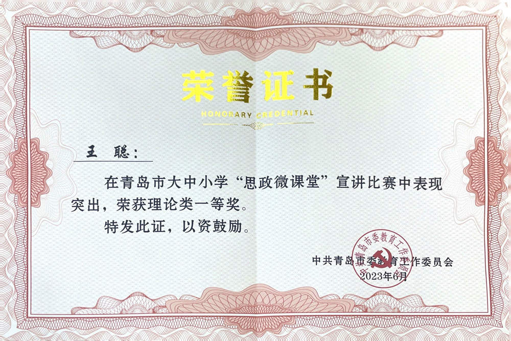 作品《弘扬伟大建党精神激发青春奋进力量》先后荣获青岛市大中小学“思政微课堂”宣讲比赛和青岛市百姓宣讲大赛理论类一等奖。