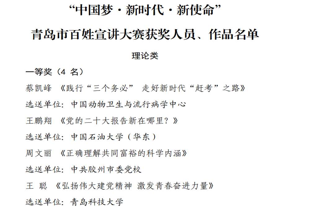 王聪老师担任宣讲人,是主题教育期间思政理论宣讲取得的又一项重要成果。本次宣讲比赛紧紧围绕“中国梦·新时代·新使命”主题,通过青岛市大中小学初赛评选和现场比赛角逐,宣讲作品获理论类一等奖(理论类表彰一等奖3名,二等奖3名,三等奖6名),并被推荐参加青岛市百姓宣讲比赛,最终斩获大赛理论类一等奖(理论类表彰一等奖4名,二等奖5名,三等奖8名)。