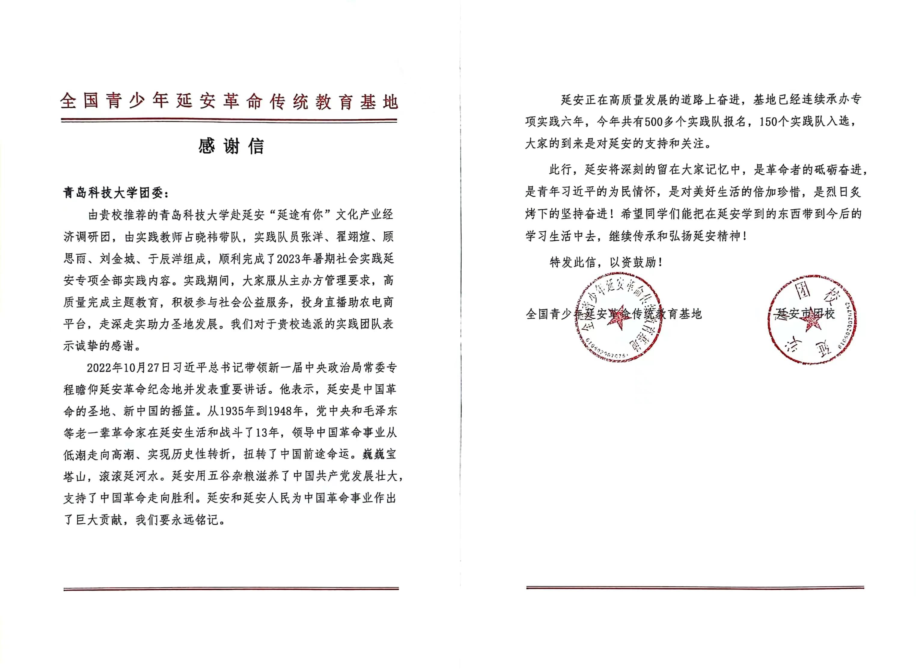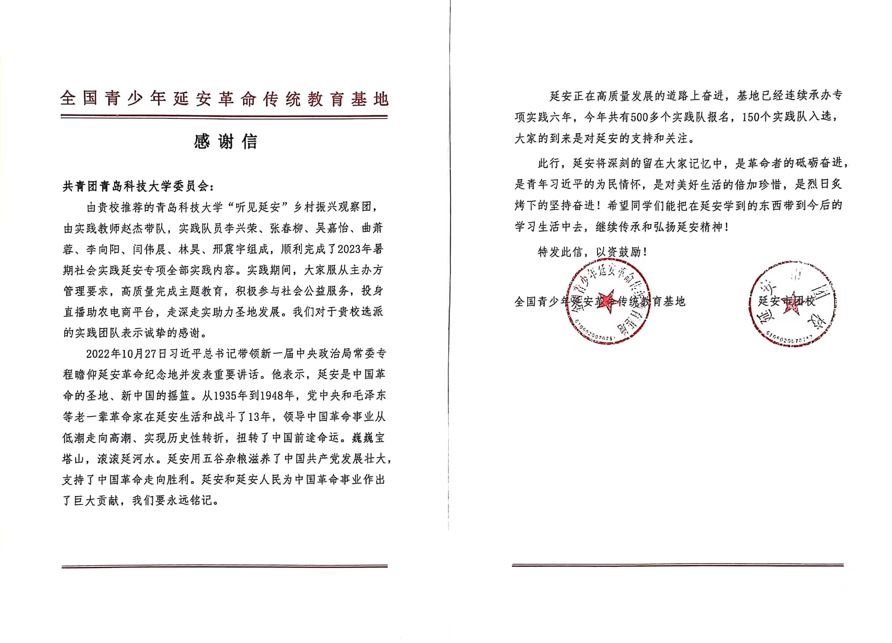 发来感谢信,对学院实践团队认真完成实践内容,结合专业优势多途径助力延安高质量发展表示感谢。