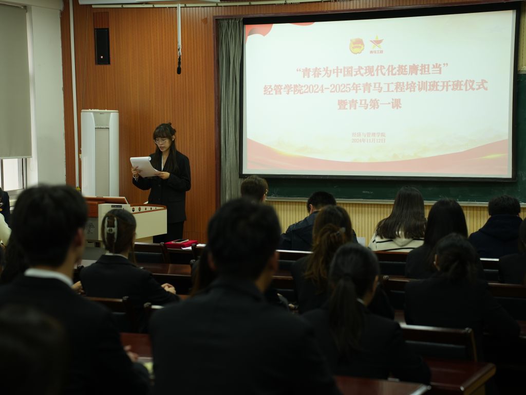 积极响应团委号召,于11月12日下午在经管楼419会议室举行“青春为中国式现代化挺膺担当”2024—2025年青马工程培训班开班仪式暨青马第一课。学院党委副书记兼副院长牛宝卫、各年级辅导员老师、青马培训班学员和部分学生代表参加开班仪式。开班仪式由团委书记付继航主持。