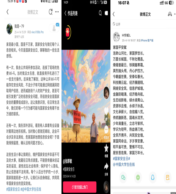 学院积极组织全体学生参与“全国大学生国家安全知识答题”专项活动,聚焦政治安全、网络安全、经济安全等16个重点领域,通过“学-练-测-评”闭环体系,引导学生将国家安全意识转化为日常行动自觉;广泛动员学生围绕“全民国家安全教育”创作短视频、海报、征文等创意作品,通过“线上+线下”双线融合,让青年真正懂安全、讲安全。