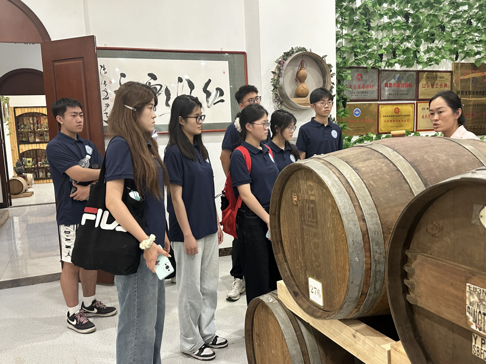 离开白里村后,实践团前往青岛爱迪尔葡萄酿酒有限公司。在酒庄负责人的引导下,队员们参观了地下酒窖、酿造车间与产品展厅。从葡萄品种的精心选育,到传统酿造工艺与现代技术的结合,再到以酒文化为核心的文旅融合探索,负责人详细讲述了企业如何依托本地资源优势,打造“种植、生产、文旅”一体化的产业生态。