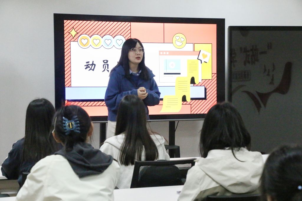 学生融媒体中心成员开展培训。她结合校园活动宣传、学院品牌推广的真实案例,阐释成员如何发挥 “内容生产者、传播推动者、形象塑造者”作用,引导全体学生融媒体骨干提前规划宣传节点,制定工作清单,既做好学院信息传递的“发声筒”,又成为师生喜爱的“内容创作者”。