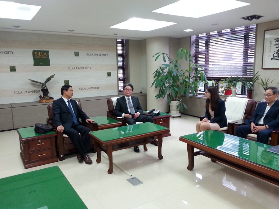 在韩国新罗大学校访问期间,新罗大学校总长朴泰学教授接见了李立院长一行。其间,李立院长还与新罗大学国际交流处处长、商经学院院长、人文社会科学学院院长进行了会谈。