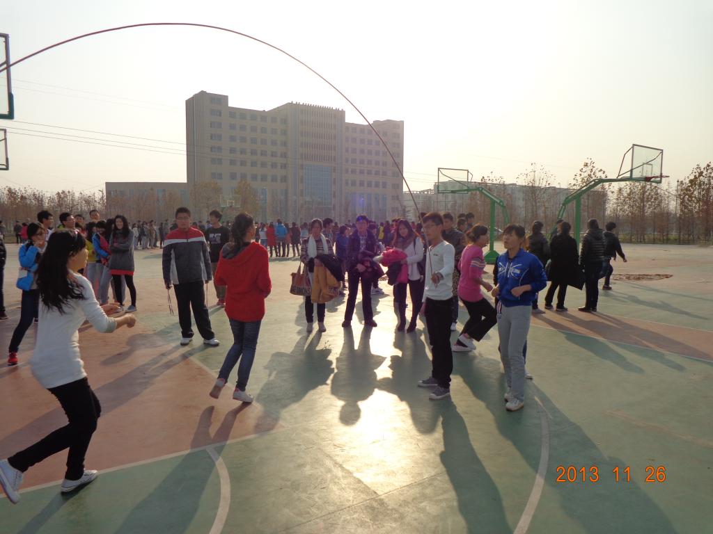 为丰富同学们的大学生活,增强体育锻炼意识,提高集体合作精神。近日,高密校区在二期篮球场举行“跳大绳”比赛。本次比赛以系为单位组队,共有9支队伍参赛。