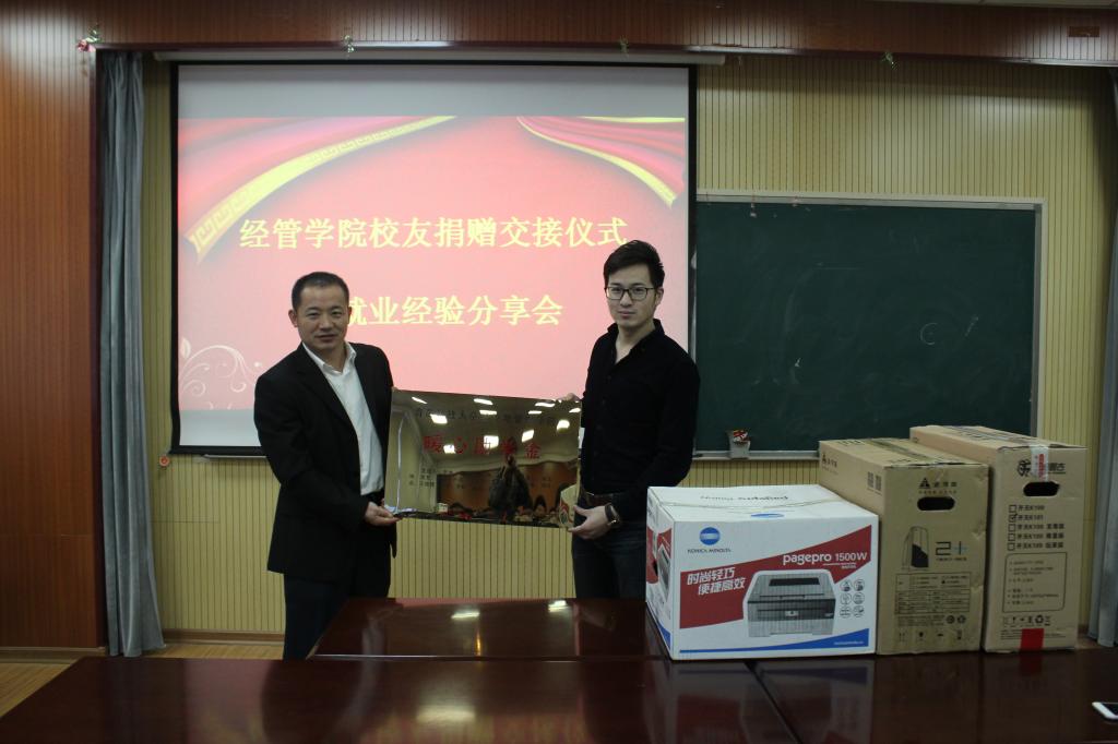 于419室举行校友捐赠仪式暨就业经验分享会,学院2006届-2013届学生会主席团代表专程回到母校,向学院捐赠电脑。学院党总支副书记兼副院长张同雷同校友代表一起出席了此次仪式,仪式由学院分团委书记高洪涛主持。