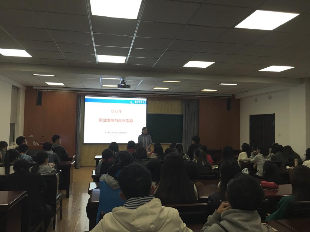 10月17日,久久小说 针对2013级毕业生开展了职业发展与就业指导讲座。讲座在经管楼419举行,久久小说 辅导员李雯雯、吴秋燕出席了本次讲座。