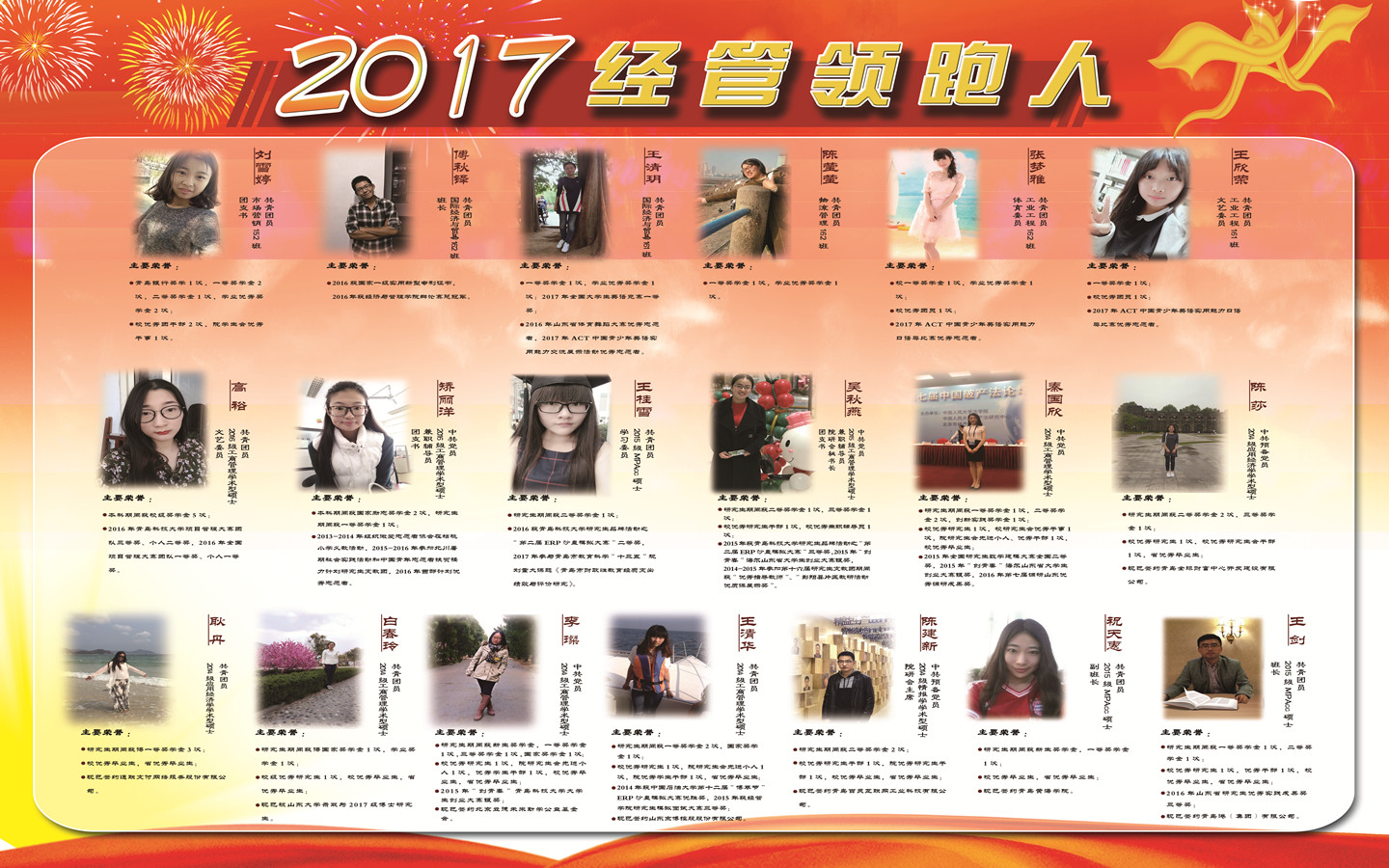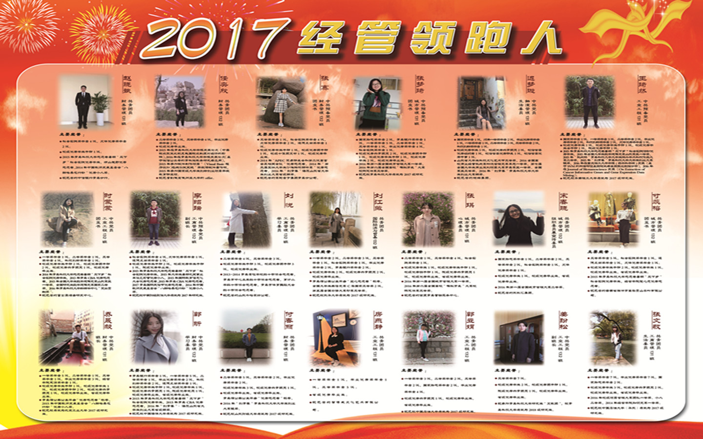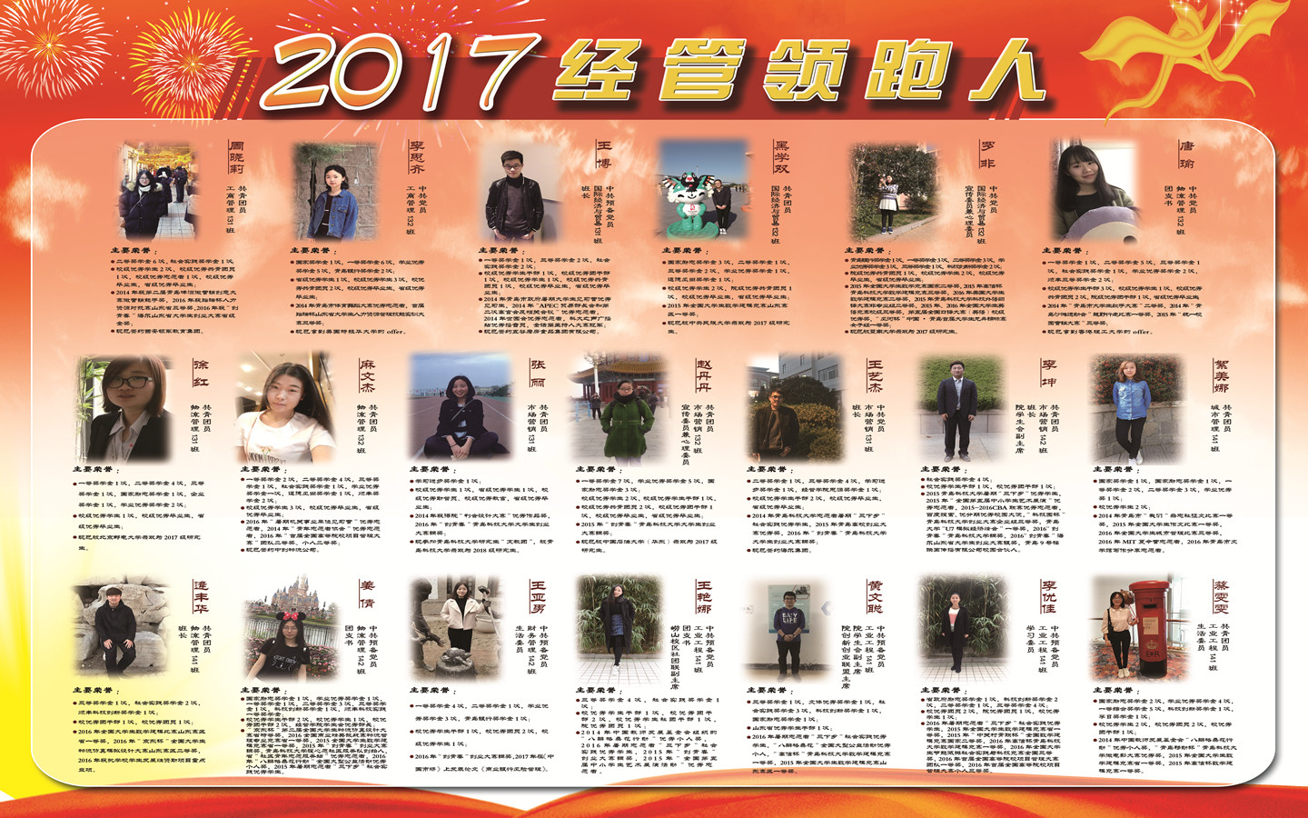 全体本科生、研究生,旨在寻找新生模范、学习标兵、创业之星、优秀毕业生及在科技创新、志愿服务、社会实践等领域的典型榜样。经过前期推荐和严格评选,共有80名优秀学子获得“经管领跑人”荣誉称号,评选活动产生了良好的带动效应,在学院掀起青春榜样风。5月4日上午,印有经管领跑人事迹简介的四块特色展板在弘毅楼前展览,吸引了过往师生纷纷驻足观看,收获了师生的一致好评。