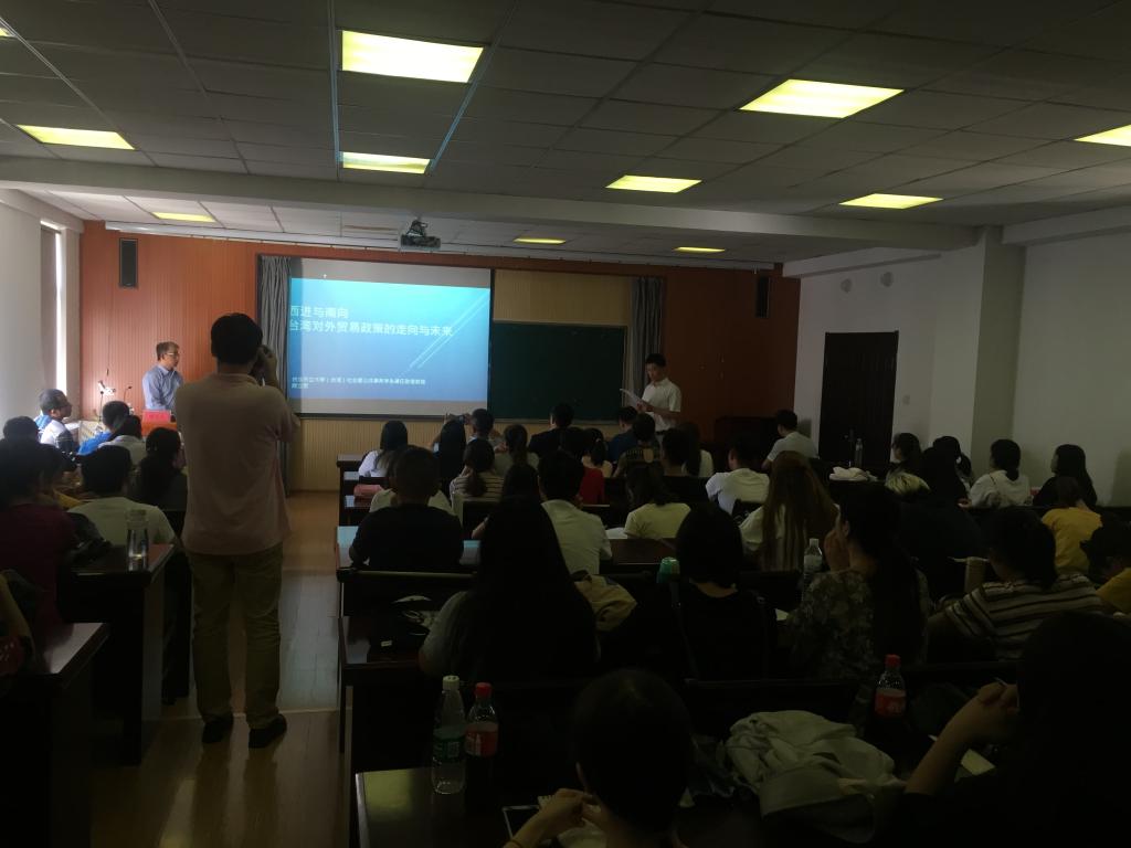 的特邀嘉宾——台北市立大学顾立民教授,杨友才副院长对顾教授作了简要的介绍并代表学院对顾教授到来表示热烈的欢迎!顾教授为大家做了题为《西进与南向—台湾对外贸易政策的走向与未来》的精彩报告。其主要内容包括五部分:台湾对外贸易的特质与发展过程;台湾与大陆的贸易现状;台湾与东南亚地区的贸易现状;蔡英文新南向贸易政策现状与困境;两岸的合作互利。顾教授认为,台湾新南向政策的实施将面临很大的困境,台湾未来的出路是:加强和大陆合作,实现合作共赢。
