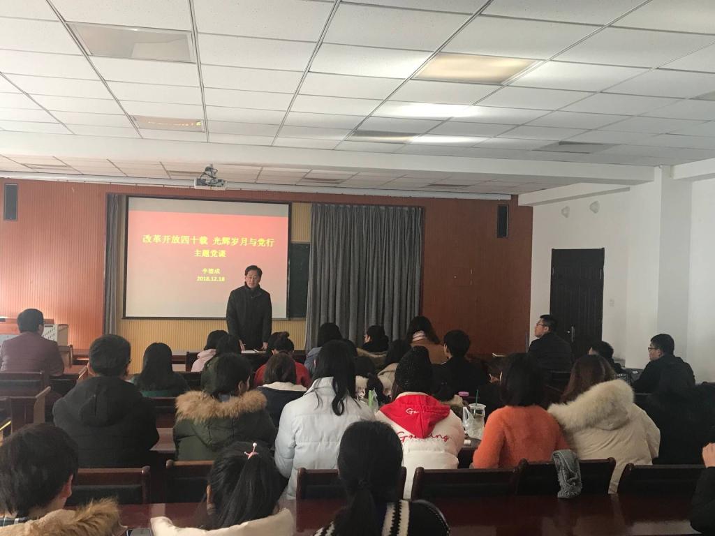 强化本领上好特色党课。下午1点,党总支书记李德成为全体学生党员上了一堂生动的党课。他带领大家回顾了祖国改革开放四十年的巨大成就,并对学生党员提出了三点要求:一是希望广大学生党员要有理想信念,坚定“四个自信”,增强“四个意识”;二是希望大家要树立全心全意为人民服务的思想,切实发挥党员的先锋模范带头作用;三是要求大家加强学习,练好本领,为祖国建设添砖加瓦。