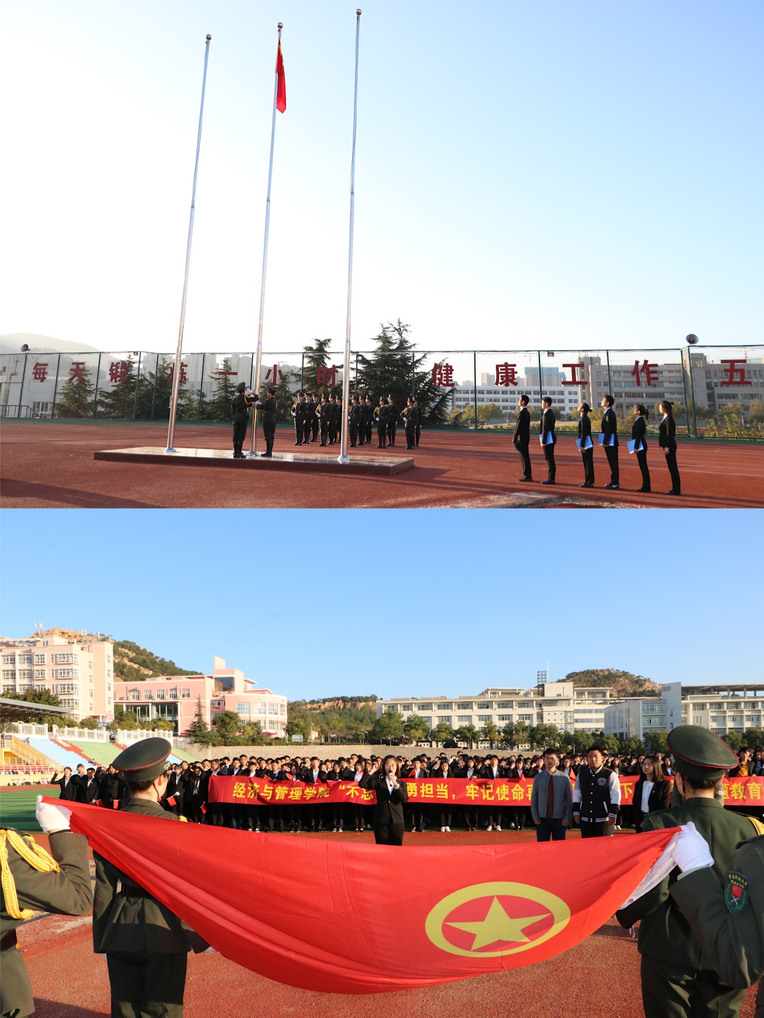 主办的“不忘初心勇担当 牢记使命再出发”国旗下青年说主题教育活动于崂山校区运动场如期举行,各年级辅导员和全体学生齐聚国旗下,共同参加这场具有浓浓爱国情的的教育活动。