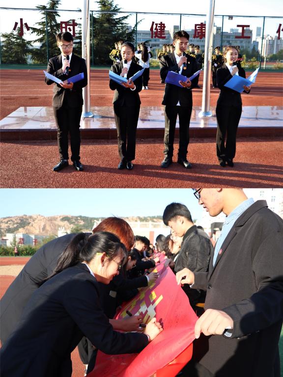 随后,全体师生面向国旗,高唱国歌,激发出经管学子接过时代接力棒、砥砺前行勇担当的无限热情。优秀学生代表、第34届学生会副主席肖映彤作了国旗下的演讲。他表示:“为了民族的复兴、国家的富强,我们要弘扬时代新思想,勇做时代弄潮儿。”接下来,由优秀学生邢筠秋、高煜婷、周志行、赵宜政朗诵了经典现代诗《我的祖国》,抒发了青年学生对祖国壮丽山河的无限赞美和建功立业新时代的精神风貌。学生会主席左靖雯作为领誓人带领全体学生面向团旗重温入团誓词,用青春梦激扬中国梦,让爱国情化为报国行。最后,全体学生在主题教育横幅上签字并留下对伟大祖国的美好祝福,以青春的名义共赴时代之约。