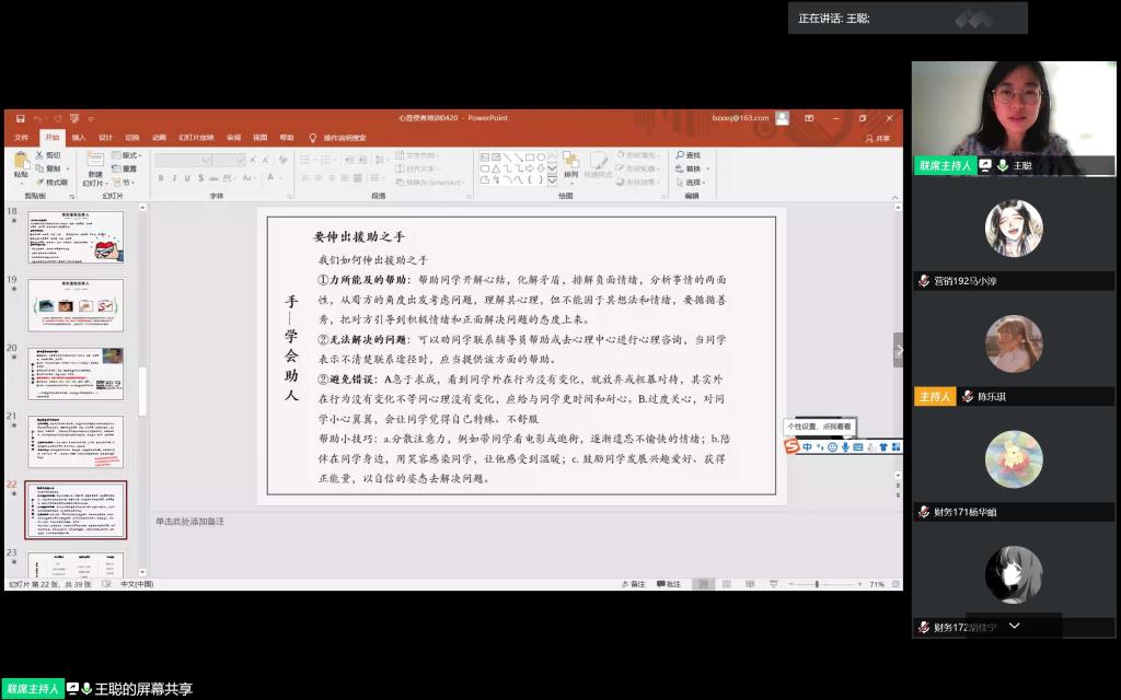 培训会上,王聪为大家讲解了疫情期间普遍存在的心理问题,以及心音使者如何调节自身心理状况带领同学在疫情期间共同度过心理难关。她强调心音使者是学校四级心理健康工作网络中的核心工作队伍,也是班级心理健康教育的重要一环,要持续学习了解相关心理健康知识,不断提升自助和助人能力。