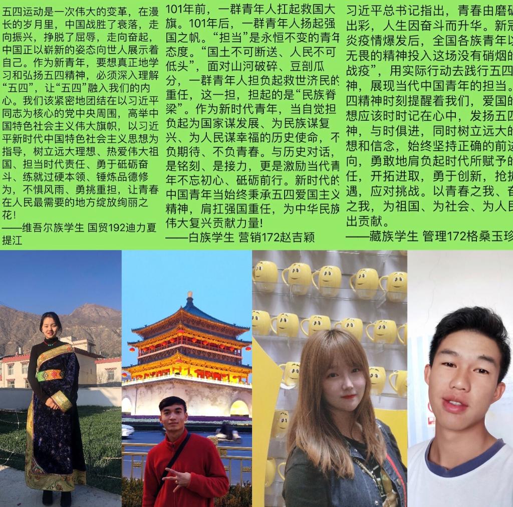 学院开展了“各族共筑中国梦,爱国精神永流传”少数民族“青年说”活动,带领少数民族学生回顾疫情期间涌现出的90后“最美逆行者”感人事迹,通过视频会议“云分享”学习感悟,共同上好这堂青春大课、信仰大课。市场营销162班维吾尔族学生热依汗感慨发言:“青年一代有理想、有本领、有担当,国家就有前途,民族就有希望。1919年,青年为国奋起,奔走街头;2020年,青年秉承先志,一线抗疫。危难关头,‘我上’是青年的誓言,‘不退’是青春的姿态!”