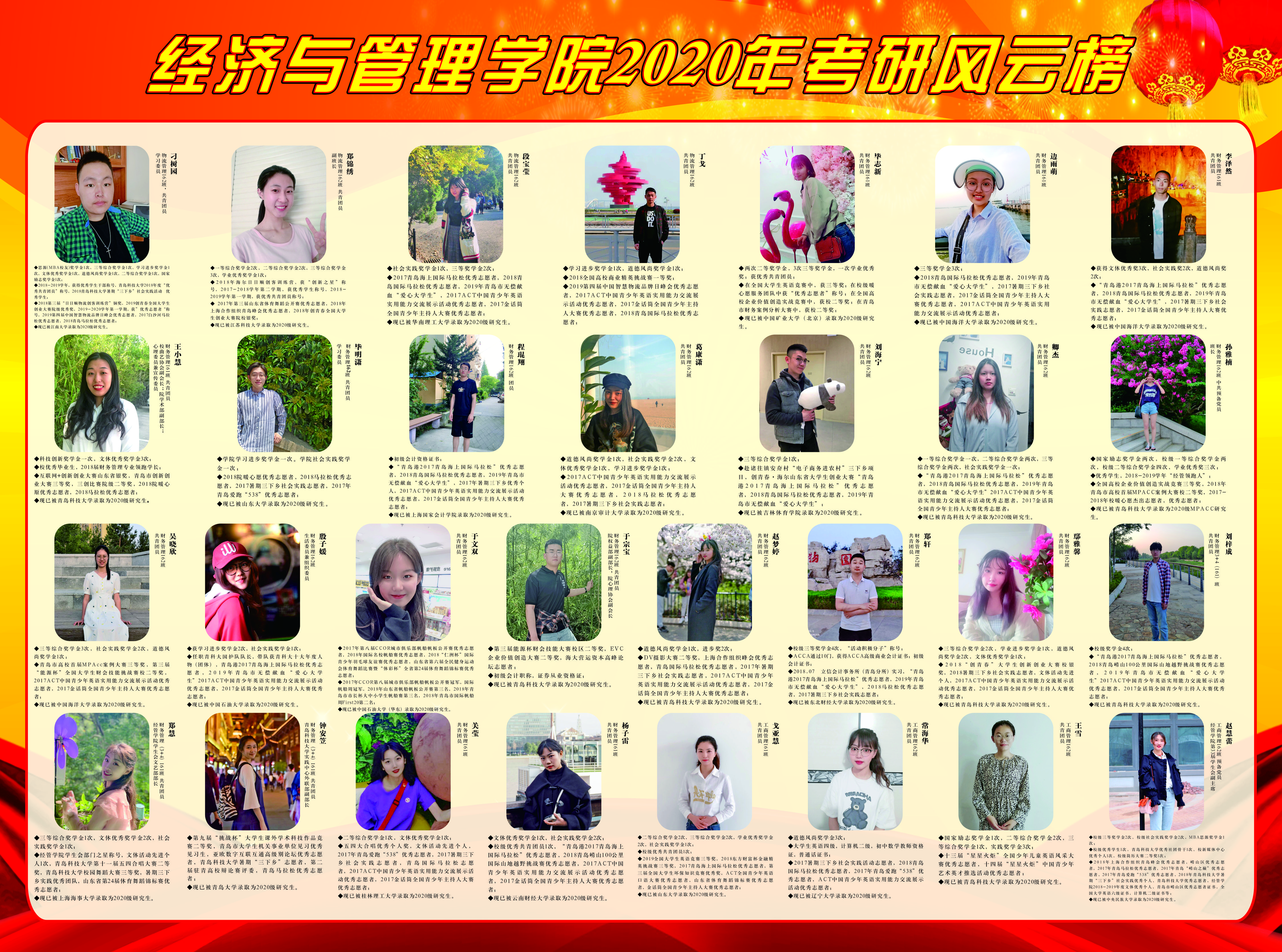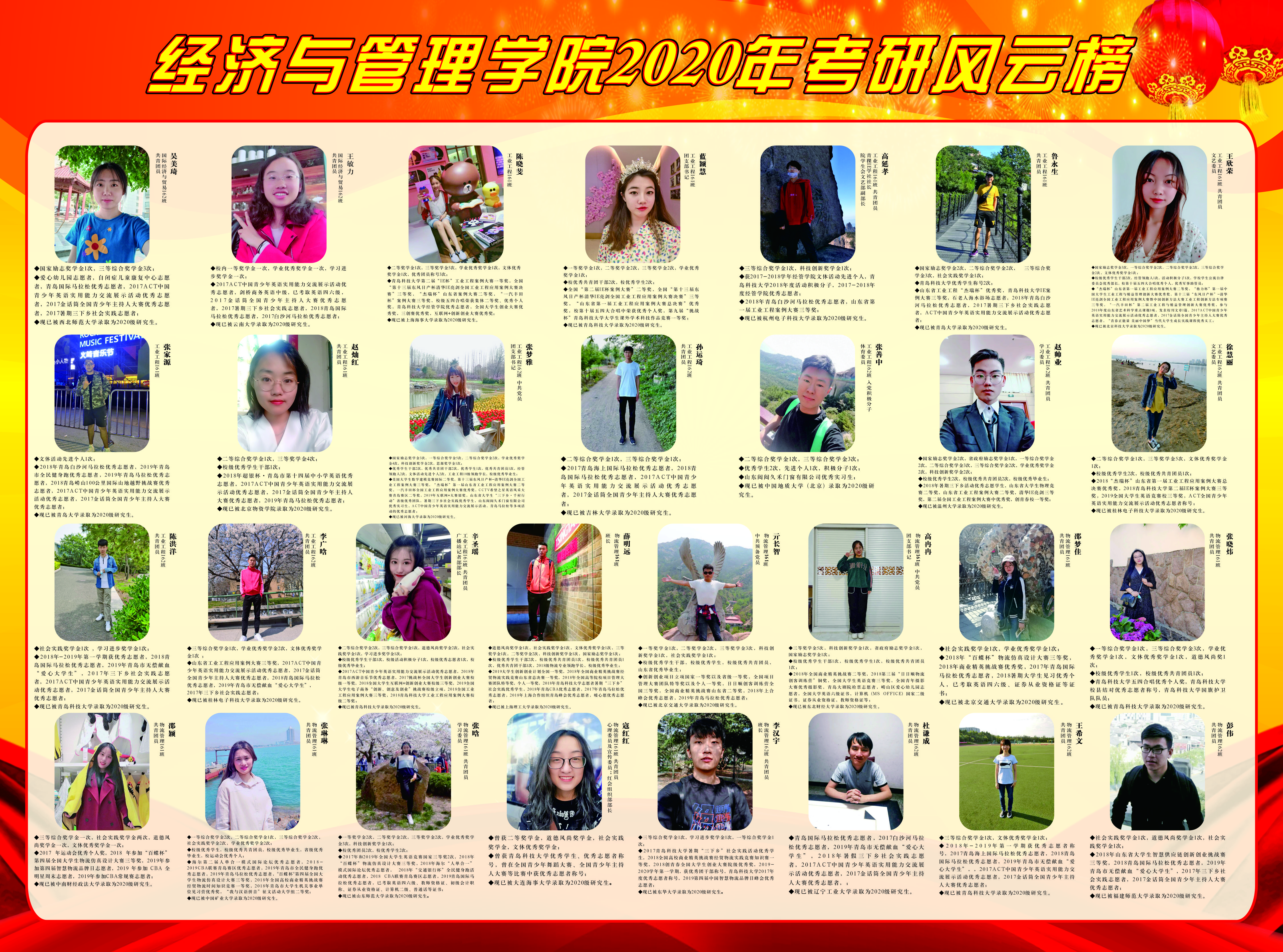 的考研工作较之以往又上新台阶。据统计,国内外升学最终录取人数122人,双一流高校录取人数58人,总考研率达24.94%,较去年提升近5个百分点。其中,国际经济与贸易专业考研率37.5%,工商管理专业考研率14.71%,财务管理专业考研率23.97%,工业工程专业考研率30.51%,城市管理专业考研率10.34%,市场营销专业考研率19.35%,物流管理专业考研率40.35%。为进一步夯实学院学风建设,树榜样,立标杆,营造浓厚学术氛围,特推出“考研风云榜”展示活动,具体如下: