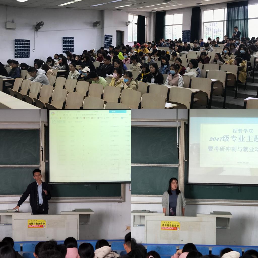 于弘毅楼E303、104室分专业召开2017级考研冲刺与就业动员大会。会议由17级辅导员张显全老师、张鸣老师主持,17级全体学生参加。