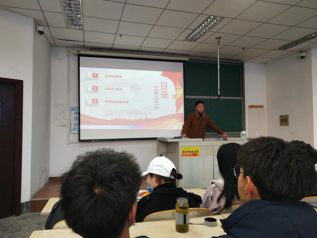 本次会议从校园防疫安全、考研就业、爱党爱国教育准备三个方面展开。在日常校园防疫方面,两位老师和同学们强调了现阶段防疫工作的重要性,要求大家结合下发的学校春季学期防疫材料规范请假程序、保持宿舍卫生、注意身体健康,坚持每日填报健康信息,确保在校期间健康学习与生活。