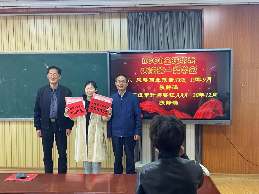 会上,学院党委书记李德成、副院长宫攀为获得单科奖学金的学生颁发奖学金和荣誉证书;院长李勋来为两次获得大陆第一的优秀学生张静涵颁奖。张静涵目前已经通过ACCA全部科目,且所有科目均为一次性通过,获得了战略商业报告(SBR)2019年9月全球统考和高级审计与鉴证(AAA)2020年12月考季全球统考两个科目状元。颁奖仪式结束后,她为同学们做了经验分享,良好的学习态度和学习习惯是取得优异成绩的制胜法宝。
