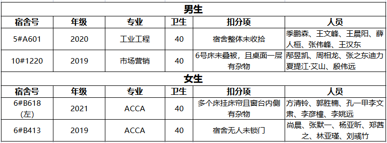 学生会于每周周二下午对全院宿舍进行常规检查,同时,为确保应急事件的快速有效处理,守好学生安全责任田,学院构建“领导小组-辅导员-楼长-楼层长-宿舍长”学生宿舍管理体系,网格员每晚监督落实宿舍晚点名制度,做好学生心理、安全、卫生等各方面的积极关注,各楼长、楼层长及舍长统筹管理、各司其职,及时反馈、全面掌握宿舍实际情况。第六周检查情况如下: