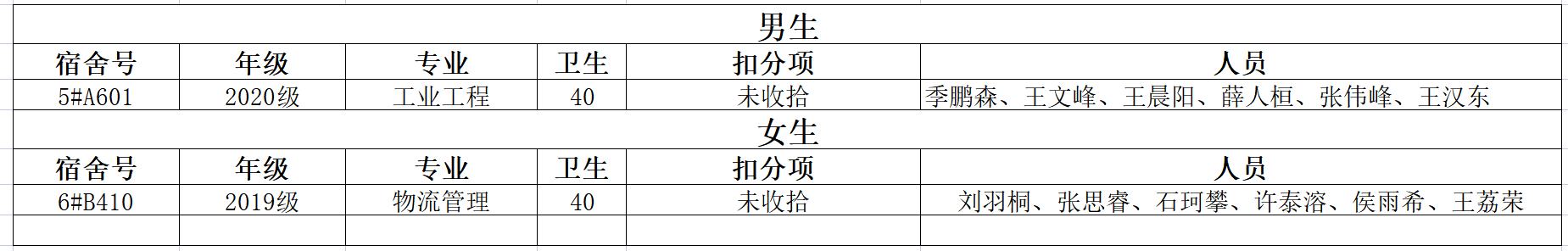 卫生检查结果及扣分细则请见附件,请各年级对照问题监督好不合格宿舍的整改。