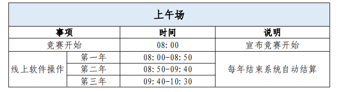 注:上表时间仅供参考,以实际发生为准。若出现某赛区参赛团队数量特别多,竞赛组委会将视情况分为上下午进行竞赛,一切以组委会通知和实际发生为准。若参赛团队无法按时提交决策,视同弃权。
