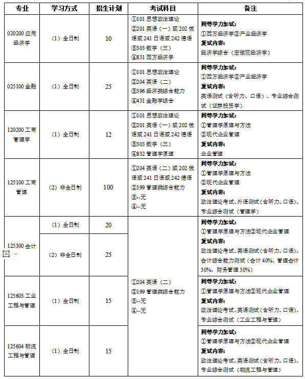 目前有工商管理学、应用经济学2个一级学科硕士点,工商管理专业硕士(MBA)、专业会计硕士(MPAcc)、工程管理专业硕士(MEM)、金融专业硕士(MF)4个专业学位硕士点。2025年硕士研究生招生章程如下: