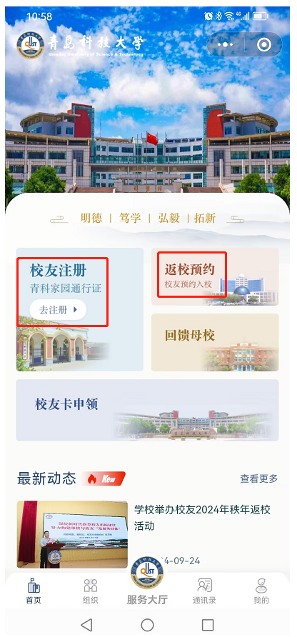 进入后选择“校友注册”和“返校预约”,可以登记返校信息及车牌信息。