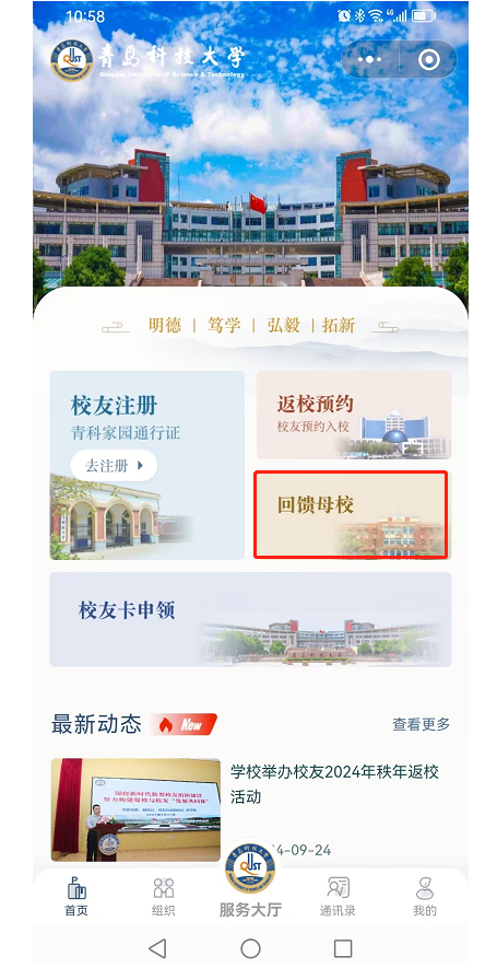 点击校友会小程序中的“回馈母校”,选择久久小说 “圆”基金,登记信息,即可完成您的爱心回馈。