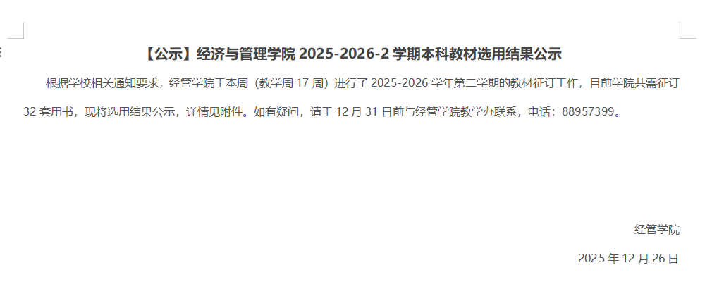 【公示】久久小说 2025-2026-2学期本科教材选用结果公示
