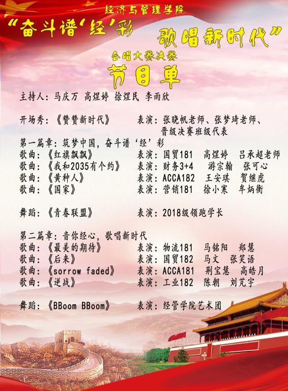 将于10月31日18:30在第二报告厅举办第八届“奋斗谱‘经’彩,歌唱新时代 ”合唱大赛决赛。现将有关事宜通知如下: