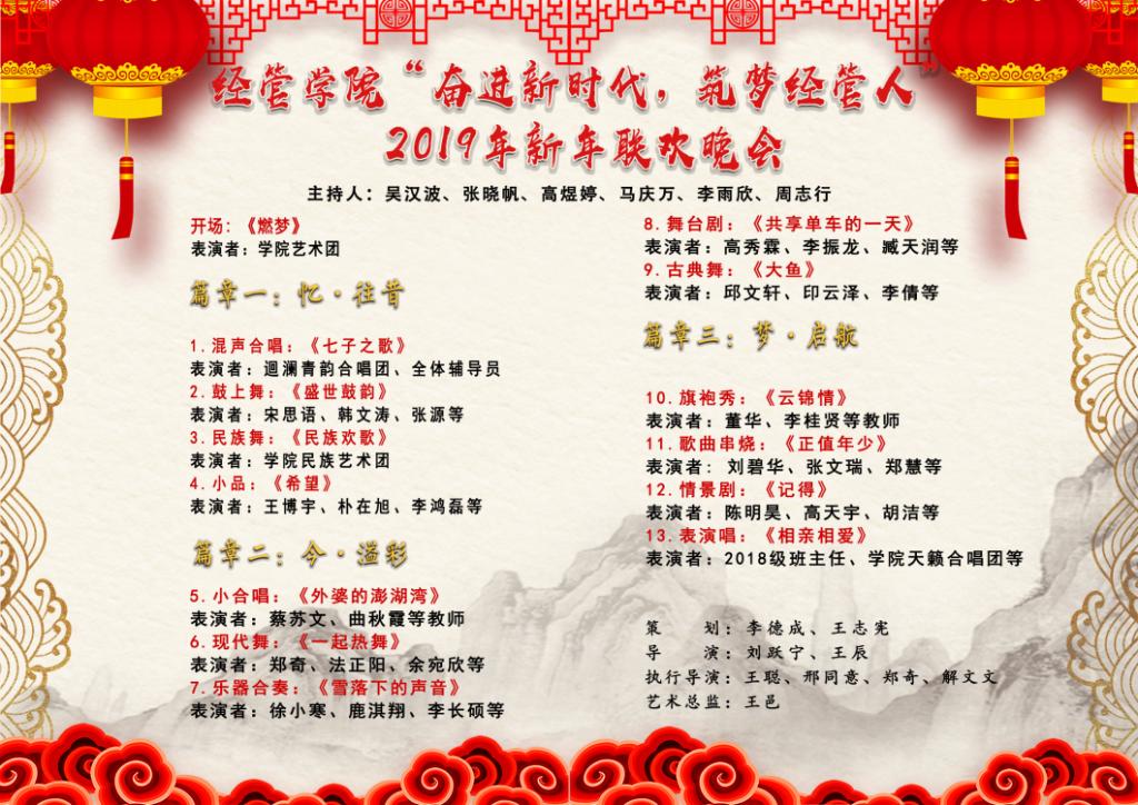 新年晚会集舞蹈、小品、独唱、合唱、舞台剧等多种表演形式于一体,欢迎广大师生前往观看!