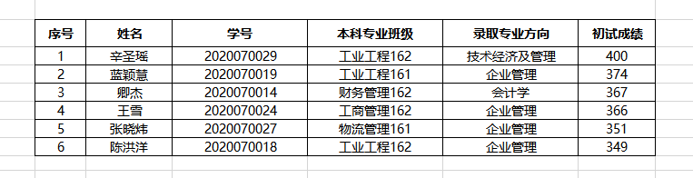 工业工程162班辛圣瑶等6名同学获得研究生新生奖学金,奖励人民币6000元,名单公示如下: