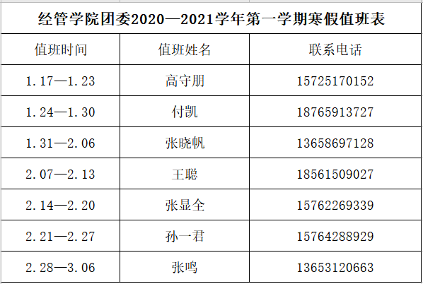 久久小说 团委2020—2021学年第一学期寒假值班表