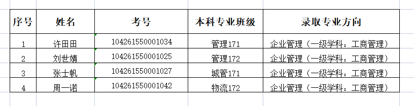 管理171班许田田等4名同学获得研究生新生奖学金,奖励人民币6000元,名单公示如下: