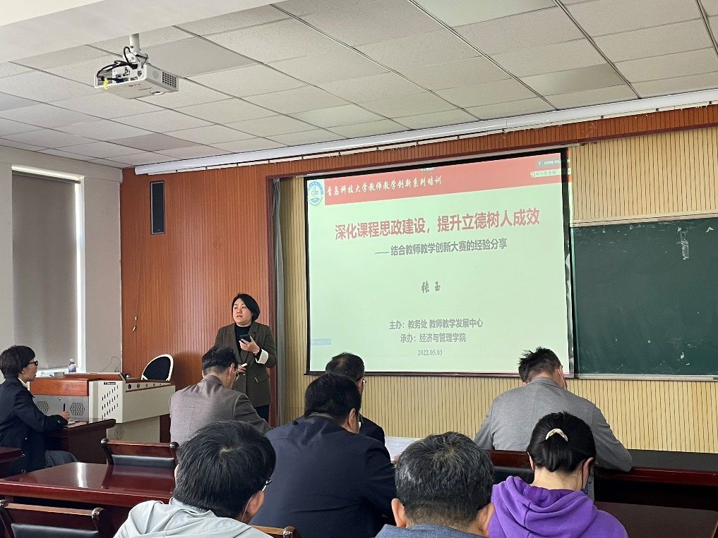 会上,张以自己讲授的《税收学》课程为例,结合自己的教学实践,从教学创新大赛与课程思政、课程思政实施过程、课程思政实施效果等四个方面进行了经验分享,从教学创新大赛评分表入手,详细分析课堂教学实录视频、教学创新成果报告和教学设计创新汇报中课程思政的重要性,建议教师们要根据自己的课程特点,围绕教学目标,深入挖掘思政元素,有机融合思政元素与教学内容,润物细无声地培养学生善于观察思考、敢于实践,勇于探索的精神。