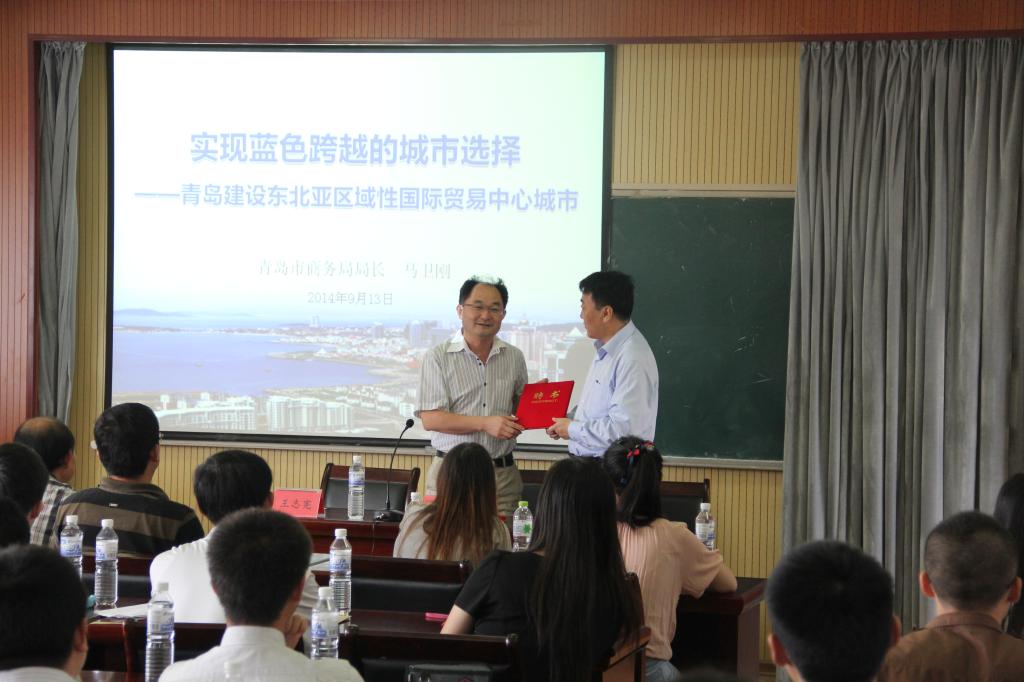 504教室,来自青岛市商务局局长马卫刚教授,为2014级MBA学员做了题为《实现蓝色跨越的城市选择--青岛建设东北亚区域性国际贸易中心城市》的专题报告会,会议由MBA教育中心主任李立教授主持。