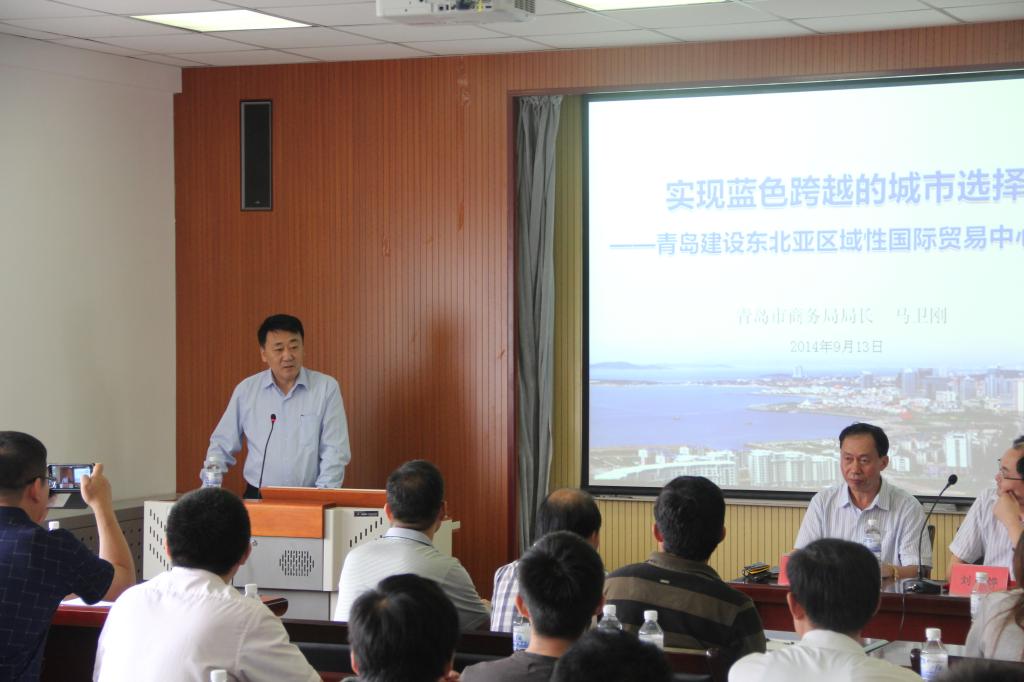 马卫刚局长的讲座紧紧围绕“建设青岛成为东北亚区域性国际贸易中心城市”的主题,以“青岛商贸发展的历史”为引线,从唐宋时期的板桥镇、新中国成立后的外贸港口城市、改革开放时期沿海开放城市、全球化时代东北亚国际贸易城市等多个方面进行了讲述。针对青岛市政府出台的《青岛市国际贸易中心城市建设纲要(2013--2020)》进行了解读,指出以加快建设国际贸易中心城市为契机,打造青岛蓝色经济科学发展升级版,着力打造“六大中心”,到2020年青岛基本建成东北亚区域性国际贸易中心城市,全市电子商务交易突破1万亿元,全市国际货物贸易总值达到1500亿美元,青岛口岸贸易额3000亿美元等。