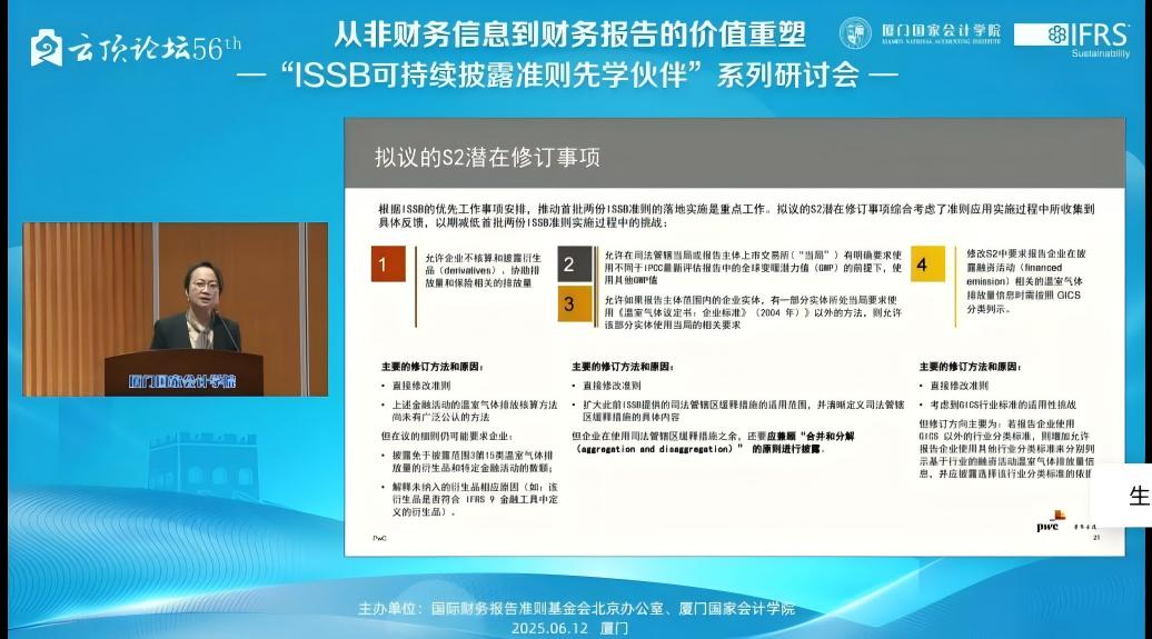 2025年6月12日,下午14:00——17:15,由国际财务报告准则基金会北京办公室与厦门国家会计学院主办的,第56届云顶论坛:从非财务信息到财务报告的价值重塑——“ISSB可持续披露准则先学伙伴”厦门研讨会在厦门国家会计学院学术报告厅B区顺利举办。同时,我校MPAcc学生也通过厦门国家会计学院微信公众号的直播同步参与了该学术讲座。