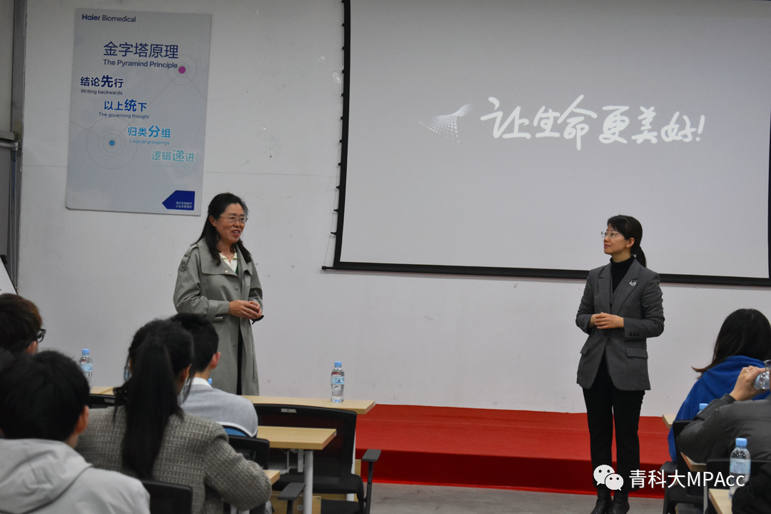 我们来到海尔生物医疗会议室,财务总监莫瑞娟女士与同学们做了两个多小时的专题交流。同学们积极思考、提问,分别涉及了财务专业、发展趋势、财税政策等方面,提出了财务预算、场景化生态、税务质量保证等问题。莫总监对我们知无不言,言无不尽。莫总监在报告中说道:“人的价值最大化”贯穿海尔发展六个战略阶段。先后向我们讲述了海尔集团的全球化布局、产业化布局以及海尔生物医疗的发展状况,站在财务角度剖析海尔生物医疗的战略定位及目标,同时为我们介绍了海尔集团基于物联网生态平台的价值衡量体系共赢增值表在海尔生物的实际应用。